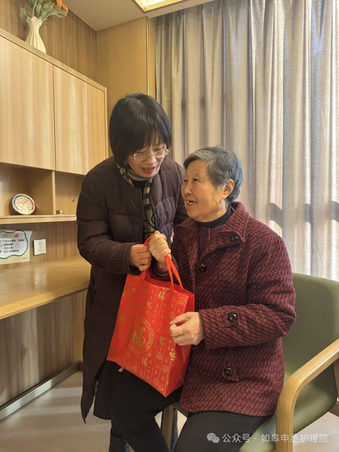 同时,院部精心为在院的长者准备了拜年礼包。沈院长与他们进行了亲切的交谈,悉心询问他们在院的生活情况,深入了解服务落实的细节,并向他们致以新春的诚挚祝福,祝愿他们身体健康、福寿安康。