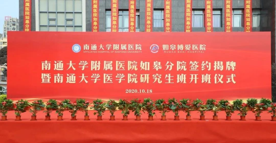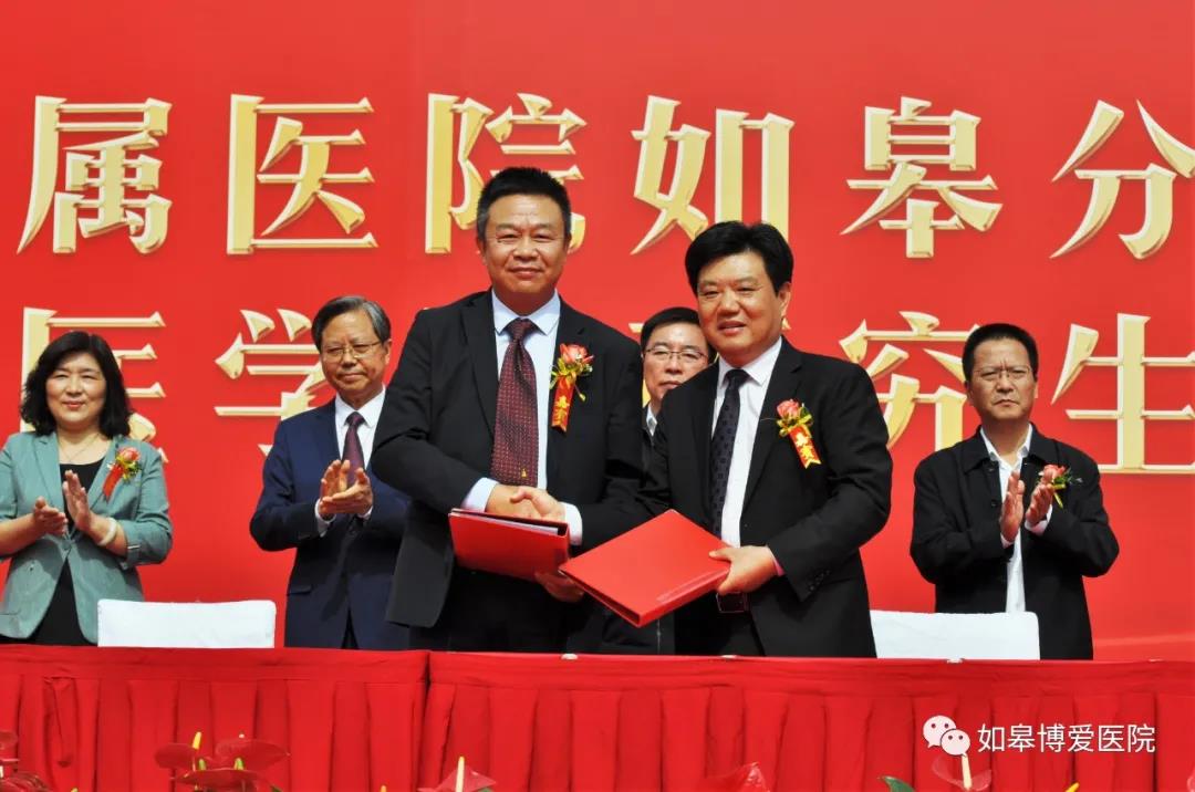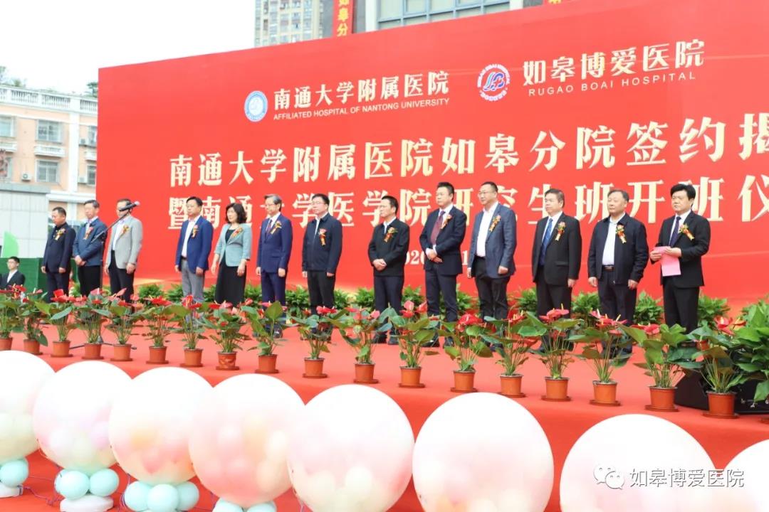 10月18日上午10点18分,南通大学附属医院如皋分院签约揭牌暨南通大学同等学力研究生班开班仪式在如皋博爱医院隆重举行。南通大学党委副书记、副校长兼南通大学附属医院党委书记高建林,如皋市委副书记、市长何益军,南通大学医学院党委书记、医院管理办公室主任史亚琴,南通市卫生健康委员会副主任沈俊涛,南通大学医学院常务副院长、附属医院副院长桑爱民,南通大学附属医院副院长顾志峰,如皋市副市长张亚鸾,南通大学研究生院副院长徐毅,南通大学附属医院原副书记彭宇飞,南通大学附属医院首席专家倪松石,如皋经济技术开发区党工委委员、管委会副主任、城北街道党工委书记赵宏祥,如皋市卫生健康委员会主任马军华,如皋市城北街道办事处主任卢小冬,江苏华医大健康服务股份有限公司董事长、如皋博爱医院董事长陈银忠等领导嘉宾200余人出席。